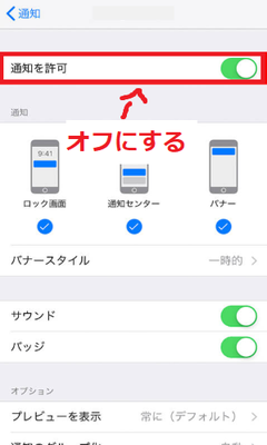 iPhone、iOS12の場合で一切の通知をオフにしたい場合は、「通知を許可」をオフにすれば拒否可能です。