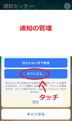 またロック画面・通知センターから拒否することも可能です。通知センターに届いている通知を、左にスワイプして、「管理」を押します。ここで「オフにする」をタッチすると通知をオフに可能です。