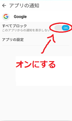 アプリ毎に通知をオフにするには、アプリケーション管理(アプリを管理) →から通知設定をしたいアプリをタップ で 「通知を表示」を押して、すべてブロックをオンにします。