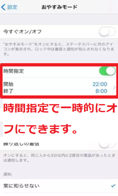 さらにおやすみモードの時間指定を設定することで、通知しない時間帯を設定することも可能です。おやすみモードをうまく利用して通知を変更してみましょう。