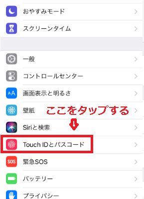 最初の画面下の中盤にある「Touch IDとパスコード」という項目を押しましょう。