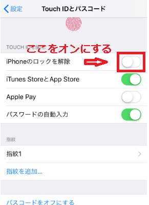 この設定は指紋認証(Touch ID)に指紋を登録してからでも変更可能ですが、ついでにオンすることが可能なのでしておきましょう。