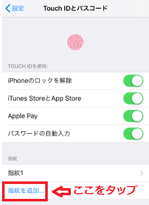 「Touch IDとパスコード」の画面の下部にある「指紋を追加」という青い文字の項目を押してください。