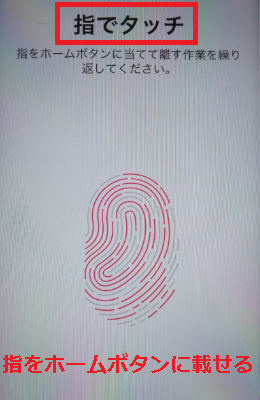 「指でタッチ」という画面でホームボタンに指を当てると、画面に赤い指紋のマークが表示されてどれくらい指紋をスキャンできたかをチェック可能です。