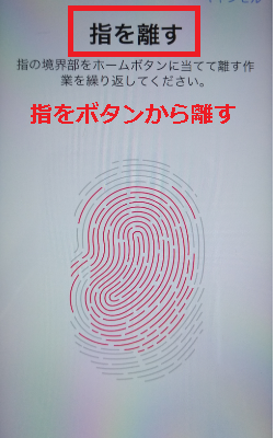ホームボタンに当てている部分の指紋がスキャンできたら、「指を離す」という文字が画面上部に表示されるのでもう1回ホームボタンを指に当ててください。