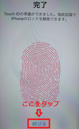 指紋の境界線をスキャンし終えたら終了という画面が表示されるので、「続ける」という文字を押してください。