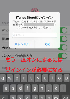 この項目をオフにしてある状態とは、iTunes Storeでの音楽購入も、App Storeでのアプリ購入もパスワードを記入しないとできない状態です。指紋認証(Touch ID)を利用してiPhoneでコンテンツを購入するのでにはオンにしておく必要があります。