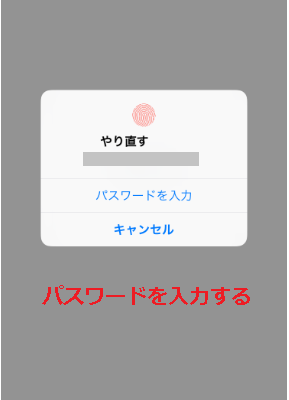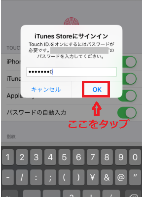 iPhoneに登録しているパスコードを記入して、「OK」を押しましょう。この画面でパスコードを記入すると、次の画面で指紋認証(Touch ID)が可能です。