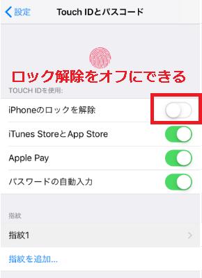 もし指が汚れている画面でiPhoneを起動することが多い場合は、設定アプリから「iPhoneのロックを解除」という項目だけオフにすれば、指紋認証でiPhoneを起動できなくなります。