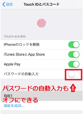また「パスワードの自動記入」もオフに可能なので、iPhoneでアプリにログインする頻度が多く、月末前に通信量の制限に達してしまうことがある人は指紋認証(Touch ID)はオフに設定しておきましょう。