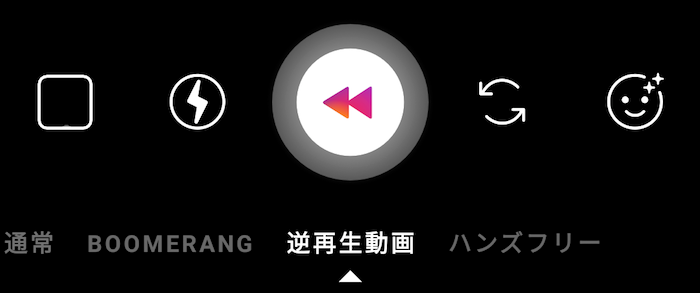 インスタグラムのストーリーから動画を投稿するには、「BOOMERANG」「逆再生動画」「ハンズフリー」のいずれかを選びます。