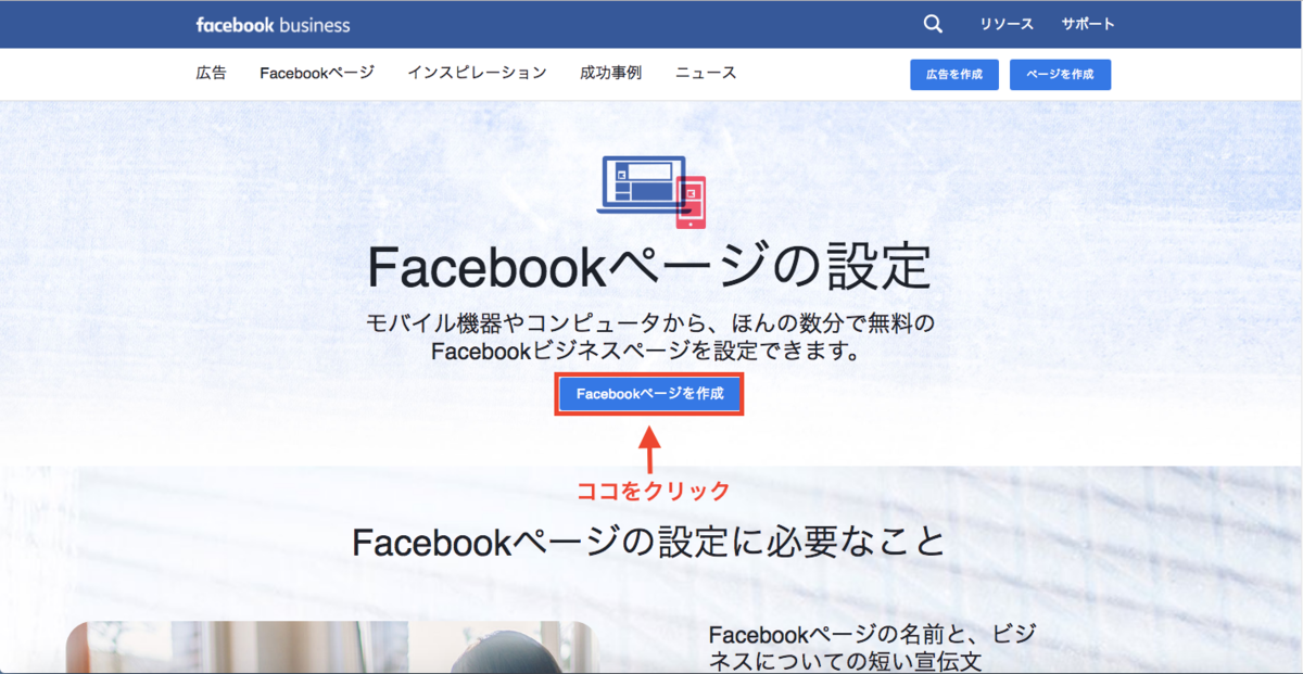 1、 「フェイスブックページを作成」ボタンを押します。