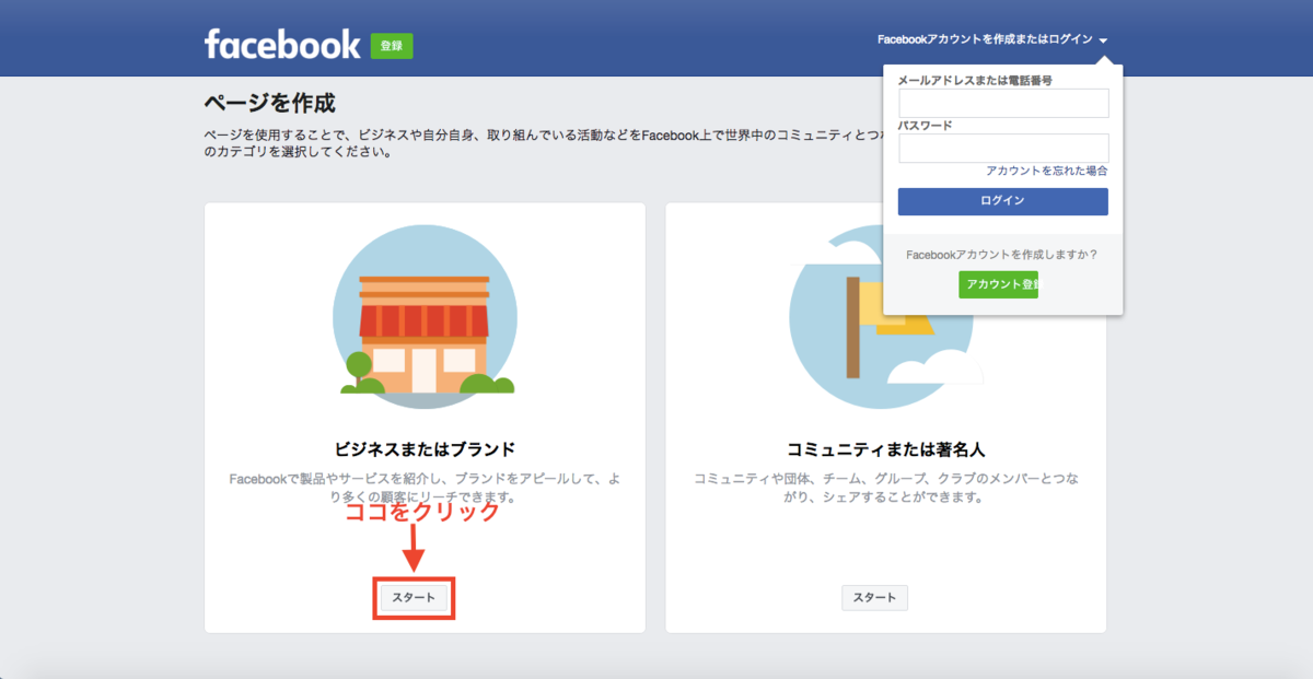 2、 次の画面で、ビジネスあるいはブランドの項目の「スタート」ボタンを押します。このときに、フェイスブックの個人アカウントが必要となるため、個人アカウントを所持していない場合は事前に作成が必要です。
