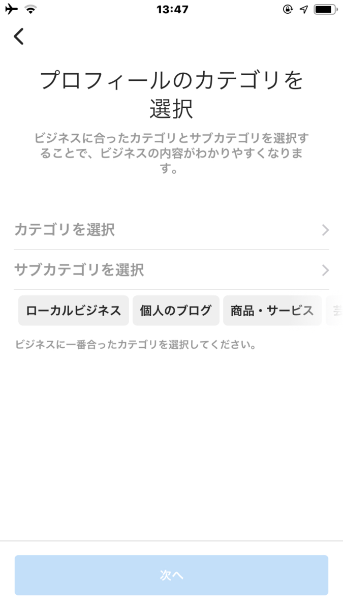 5、 ビジネスに合ったプロフィールのカテゴリとサブカテゴリを選びて「次へ」を押します。