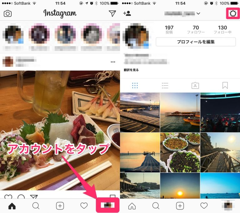 ①まず、Instagramのタイムラインのページを開け、右下部分に表示されている自分のアカウントのアイコンをタップしましょう。