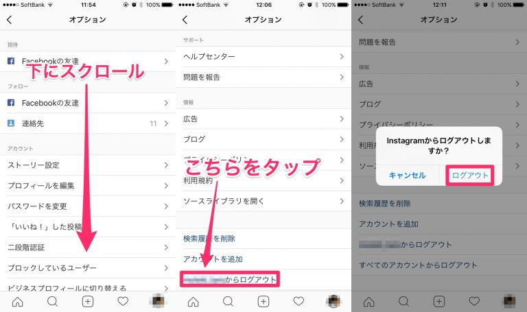 簡単にログアウトできますが、またログインしないとInstagramが使えないのが難点ですね。