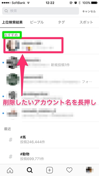 ただし、これはあくまでもInstagramの「おすすめ」に表示されたアカウントに対してだけ行えることで、タグやピープル等の履歴をひとつずつ消すことはできません。