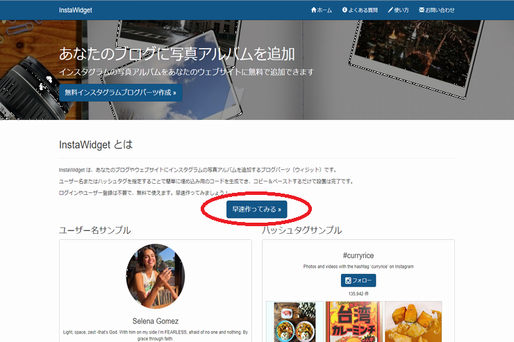 ではじっさいにInstaWidgetを使用してインスタグラムの埋め込みをするのでに、インスタグラムタイムライン一覧の埋め込みコードを生成していきましょう。まず最初はInstaWidgetのWebサイトトップから〇を押します。