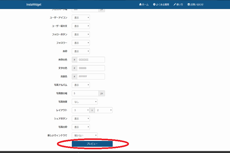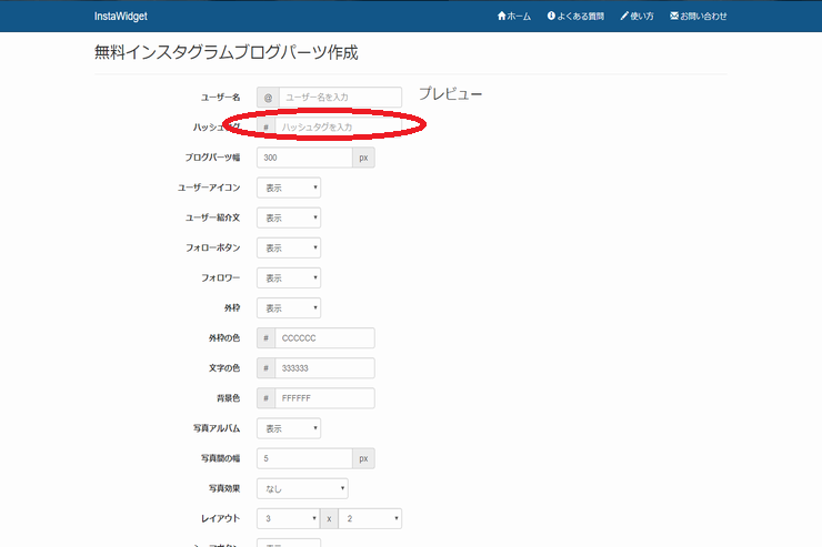 インスタグラムのInstaWidgetでの生成一覧からインスタグラムハッシュタグに「ラーメン」と記入し、下にスクロールさせていきますと〇「プレビュー」があるので押します。
