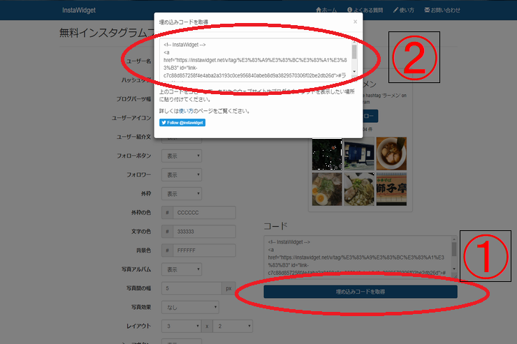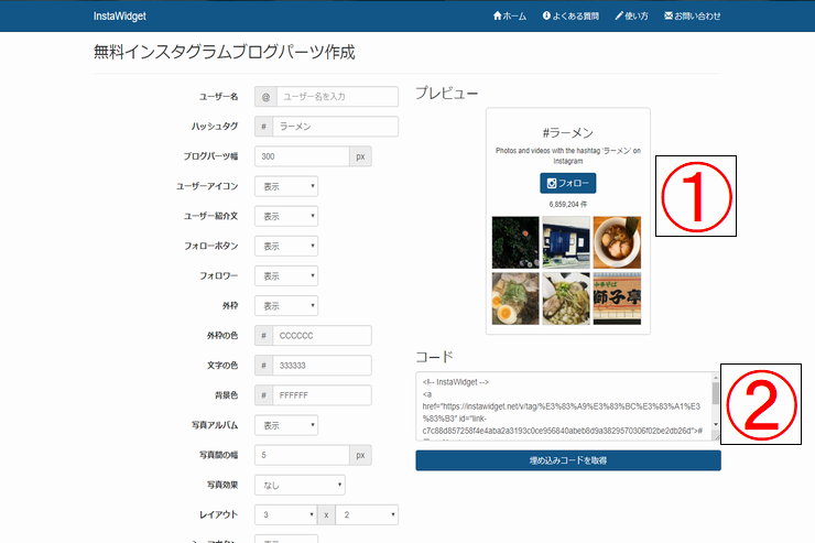 プレビューをクリックすると、実ときにWebサイトやブログに表示されるインスタグラムプレビュー画面が①に表示されます。①には画像のようにインスタグラムのハッシュタグ「ラーメン」での一覧が表示されています。