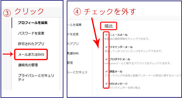 ③次に、画面左側の、「メールあるいはSNS」を押します。④購読という文字の下に、今メールで配信されている項目が複数表示されています。